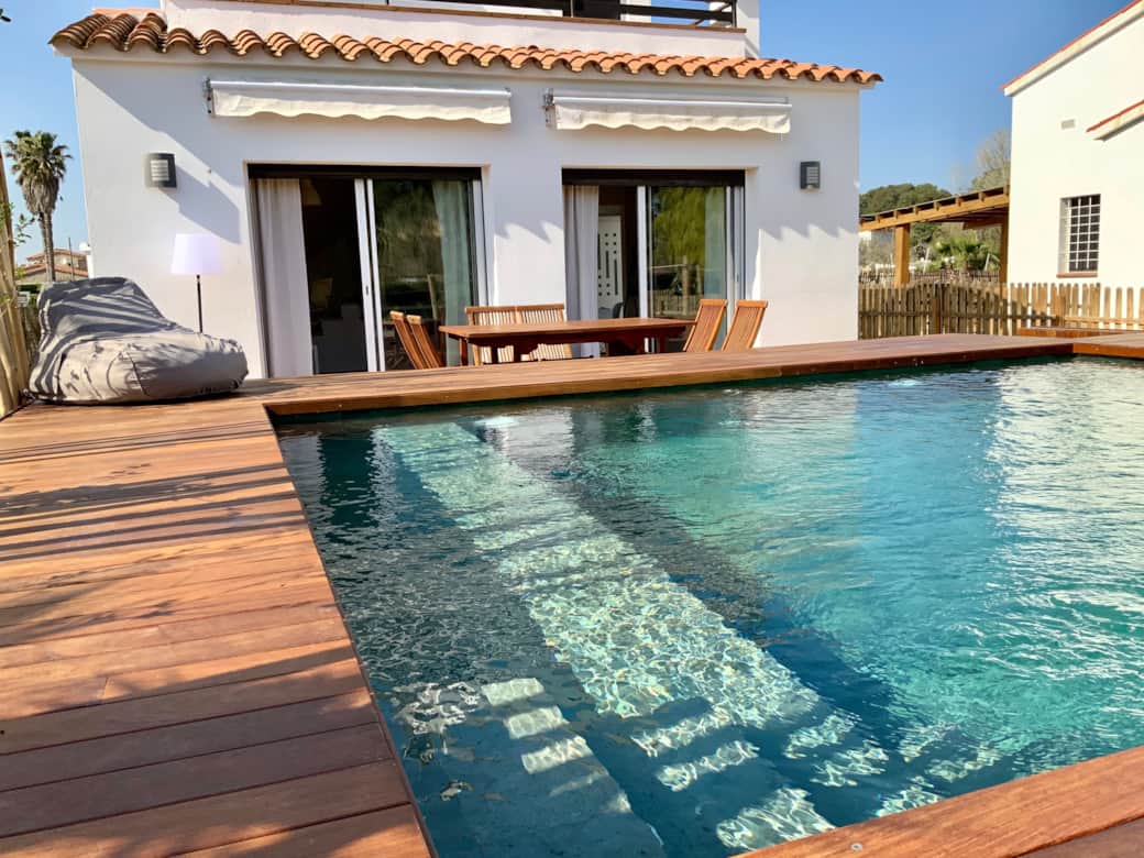 Casa amb piscina privada a l'estil Balinés.Casa preciosa, d'angles rectes i teulades a dues aigües i en diferents nivells. Dividida en planta baixa i primer pis. Entrem al jardí de la casa per la part del darrere, on trobem dues zones de porxo on aparcar els cotxes. Accedim a la casa a través d'una de les dues portes que té i trobem una zona diàfana de menjador-sala d'estar amb una cuina tipus "office". Aquest espai queda obert a l'exterior i al jardí privat a través de dues grans finestrals que comuniquen amb la terrassa, creant així una sensació de gran amplitud. Dues habitacions dobles en planta baixa amb dos banys complets amb dutxa. Al primer pis trobem l'habitació principal amb bany "en suite" amb dutxa, compta també amb terrassa privada.El mobiliari de la casa és còmode i funcional, de colors clars, amb banys en conjunt de colors suaus. A pocs metres de la platja. Sens dubte, una de les cases més valorades, tant per la seva gran jardí com per la seva situació més aïllada, a l'extrem de la finca. Ideal per a famílies que busquen preservar la seva intimitat i gaudir d'unes vacances de relaxació i descans.