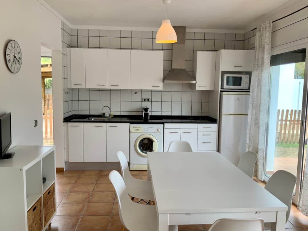 We hebben toegang tot het huis via een van de twee deuren die het heeft en we vinden een open eetkamer-woonkamer met een keuken van het type "kantoor". Deze ruimte is open naar buiten en naar de privétuin via twee grote ramen die communiceren met het terras, waardoor een gevoel van grote ruimte ontstaat.